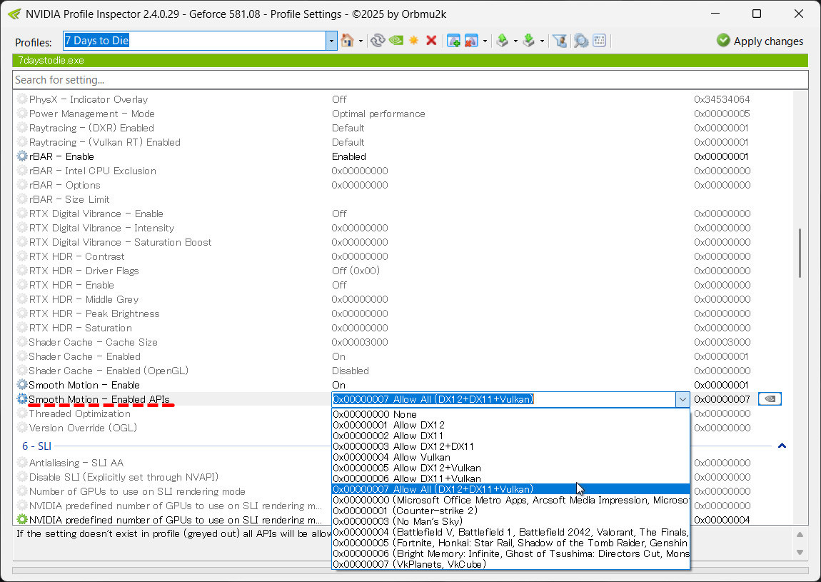 【追記】最新ドライバー581.08使用中で、検証時ProfileInspetorは古めのv2.4.0.19です。( v2.4.0.29を見逃していました )