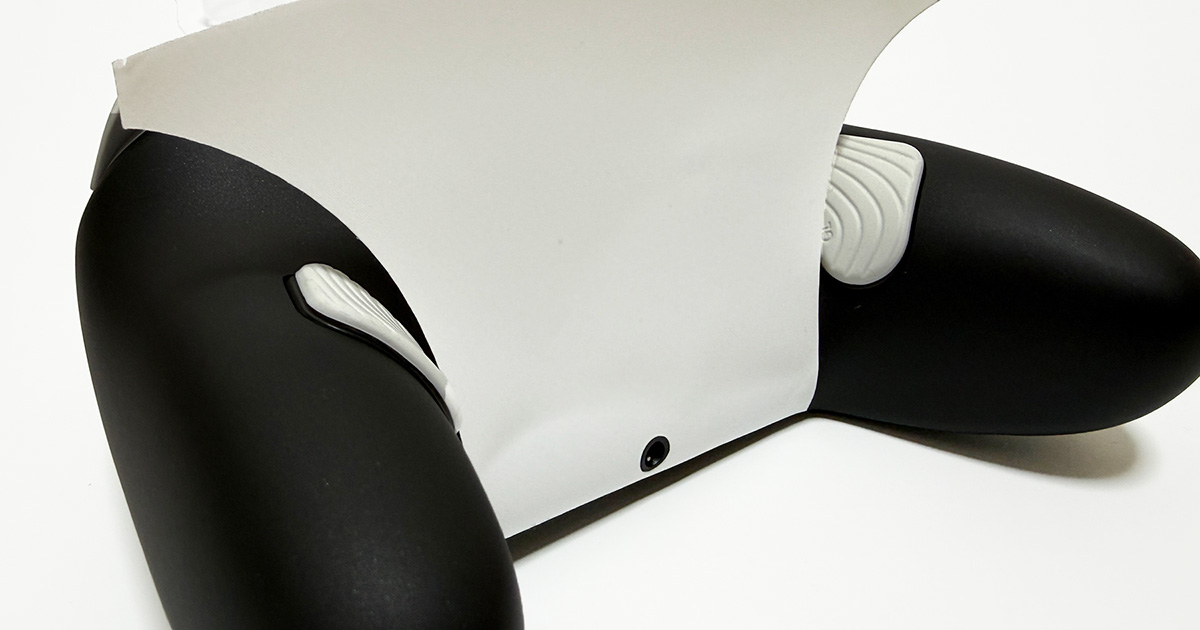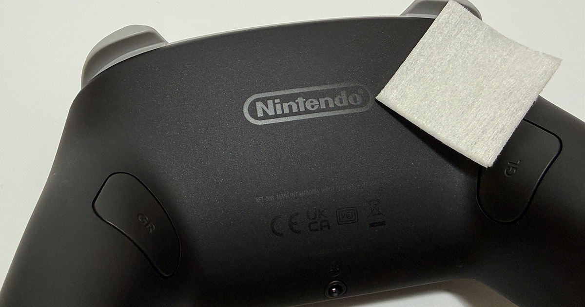 特に大きな背面部分。位置決めをやや慎重に行う必要があり、適当に貼ると確実に端っこがズレます。管理人はプロコン2の底面部のヘッドセット用端子穴に合わせました。下から上へ少しずつ押さえつけて貼るイメージ。