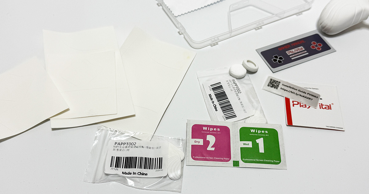 商品はシリコン部分の大きなカバー、ABXYボタン周りのシール( やや厚手 )、背面ボタンカバー( シリコン+シール )、背面むき出し部のシール( やや厚手 )、ジョイスティック部のシリコンカバーという構成です。